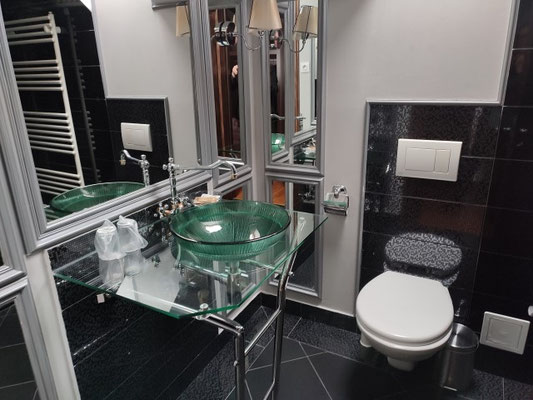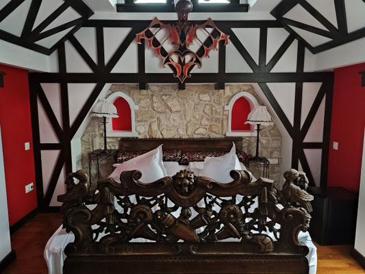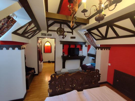 Als wir jedoch unsere Zimmer betreten, fallen uns fast die Augen aus dem Kopf und wir kommen aus dem Schmunzeln nicht heraus. So sieht also ein modernes Hotelzimmer für Dracula-Fans aus! Staunend sehen wir uns um und entdecken immer mehr witzige Details. Wir wähnen uns in einer Filmkulisse, haben aber trotz der Schauer erregen sollenden Verzierungen am und über dem Bett die ganze Nacht über wunderbar geschlafen.
